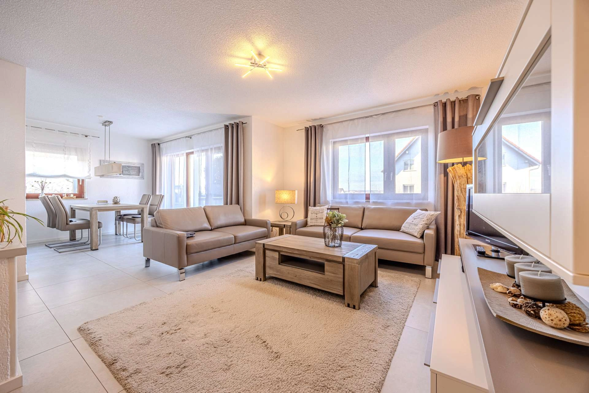 Die Wohnfläche von ca. 103 m² verteilt sich auf mehrere Ebenen und überzeugt durch eine klare Raumstruktur sowie funktionale Grundrisse. Der zentrale Lebensmittelpunkt des Hauses ist der offen gestaltete Wohn- und Essbereich im Obergeschoss mit Zugang zur sonnigen Südterrasse. Von hier aus eröffnet sich ein weiter Blick über die Umgebung und ins Grüne, ideal für entspannte Stunden im Freien.
