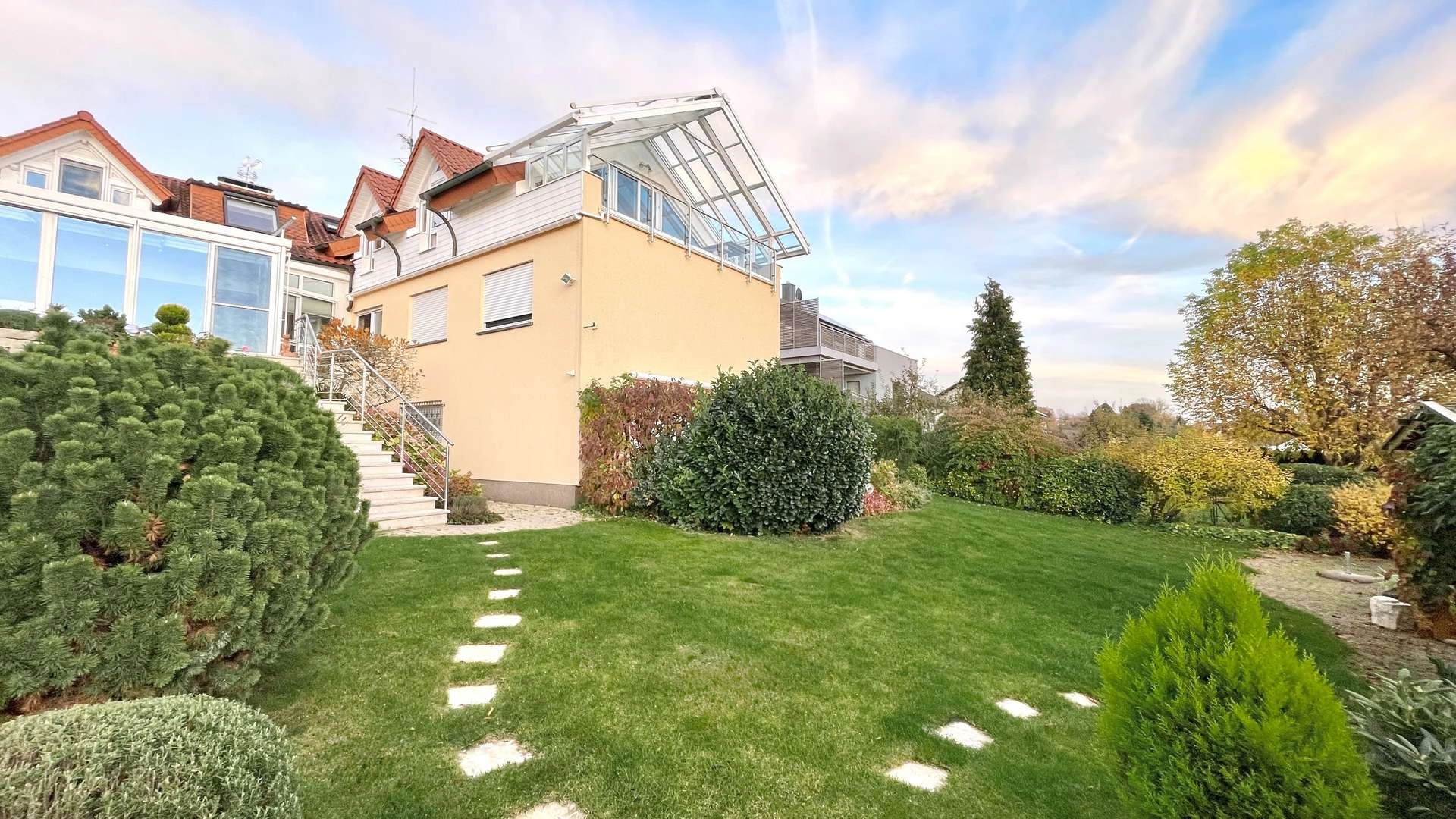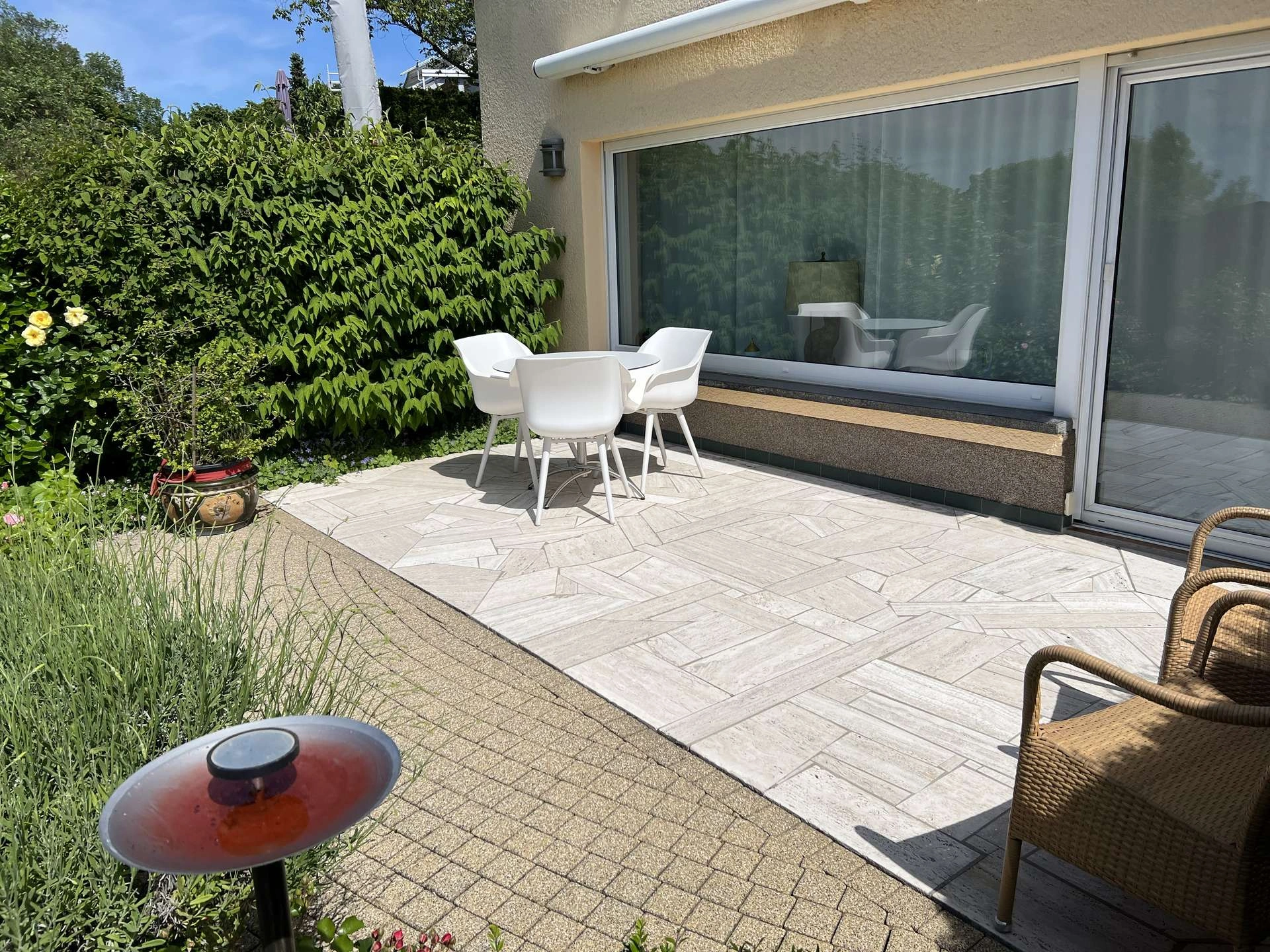Der großzügige Wohn- und Essbereich bietet direkten Zugang zur großen Terrasse, die an heißen Tagen durch eine Markise beschattet werden kann. Eine breite Fensterfront sorgt für viel Tageslicht im Wohnbereich.