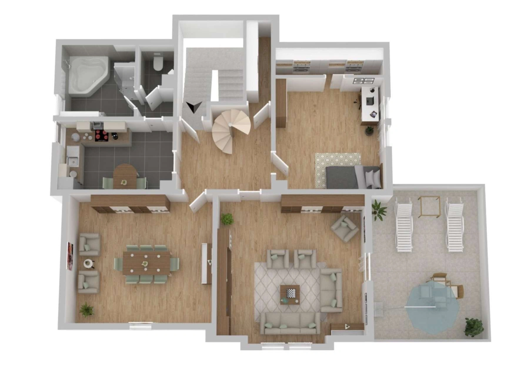 Die Raumaufteilung ist vielseitig und flexibel nutzbar: Neben dem Wohn- und Essbereich stehen mehrere Zimmer zur individuellen Nutzung als Schlaf-, Kinder-, Arbeits- oder Gästezimmer zur Verfügung. Zwei voll ausgestattete Badezimmer – jeweils mit Dusche bzw. Badewanne – sorgen für hohen Wohnkomfort. Besonders hervorzuheben ist das Badezimmer im Dachgeschoss, das mit einer integrierten Infrarotsauna ausgestattet ist – ideal für entspannte Wellnessmomente in den eigenen vier Wänden.