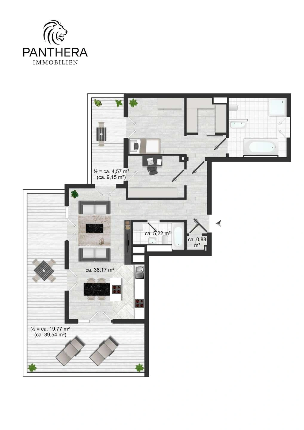 Mit einer Wohnfläche von ca. 114 m² (ca. 90 m² reine Wohnfläche zzgl. Terrasse) bietet dieses lichtdurchflutete 3-Zimmer-Penthouse ein gemütliches Wohnambiente: Zwei komfortable Schlafzimmer, ein großzügiger Wohn- und Essbereich mit offener Küche und Kochinsel sowie bodentiefe Fenster, die direkten Zugang zur großzügigen Dachterrasse ermöglichen.