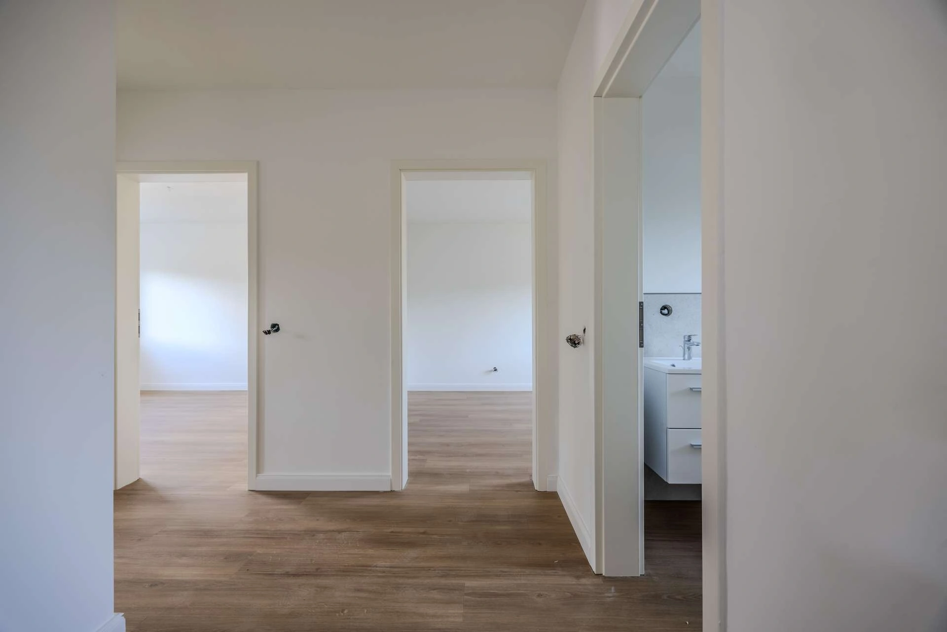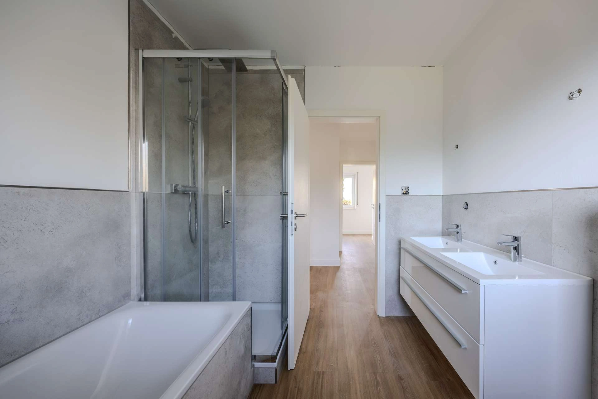 Das großzügige Tageslichtbad ist modern gefliest und ist mit Badewanne, Dusche sowie einem Doppelwaschbecken ausgestattet. Ein separates Gäste-WC bietet zusätzlichen Komfort.